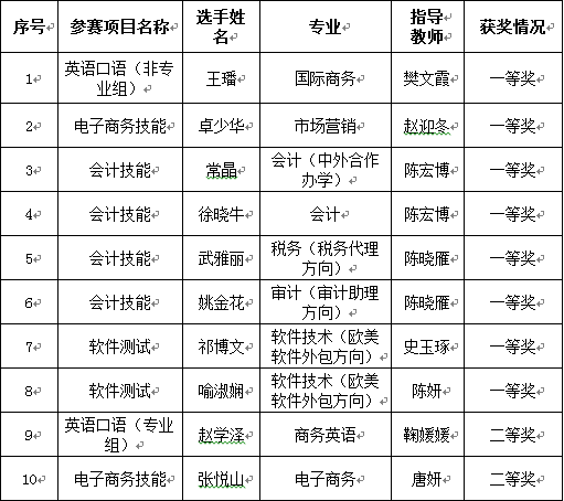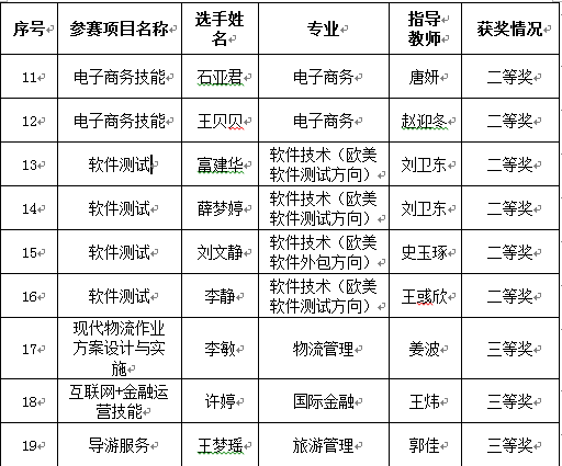 本次大赛,我校共参加了英语口语(专业组、非专业组)、会计技能(教师赛、学生赛)、软件测试、导游、电子商务技能、互联网+金融运营技能、市场营销技能、现代物流作业方案设计与实施、移动互联网应用软件等九个赛项。35名参赛选手获得了8个一等奖、8个二等奖、3个三等奖;两名教师在教师组比赛中获得二等奖的好成绩。