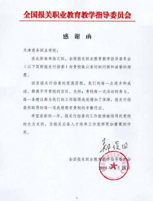 2019年春节前夕,全国报关职业教育教学指导委员会(报关行指委)向学校发来感谢函,感谢我校对全国报关职业教育工作一年来的贡献、信任和支持。