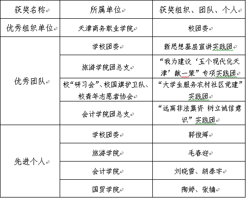 此项活动是天津共青团系统大学生实践类“龙头”活动,校团委积极发动、统筹安排,先后组建全国专项实践团队3支、市级专项实践团队18支、校级实践团队32支,共计53支实践团队300余名师生赴14个省市自治区,深入社区、村镇、机关、学校、企业、博物馆、港口等地开展实践活动。经团市委评审,我校有4支团队、6名个人分获各项荣誉。获奖情况如下: