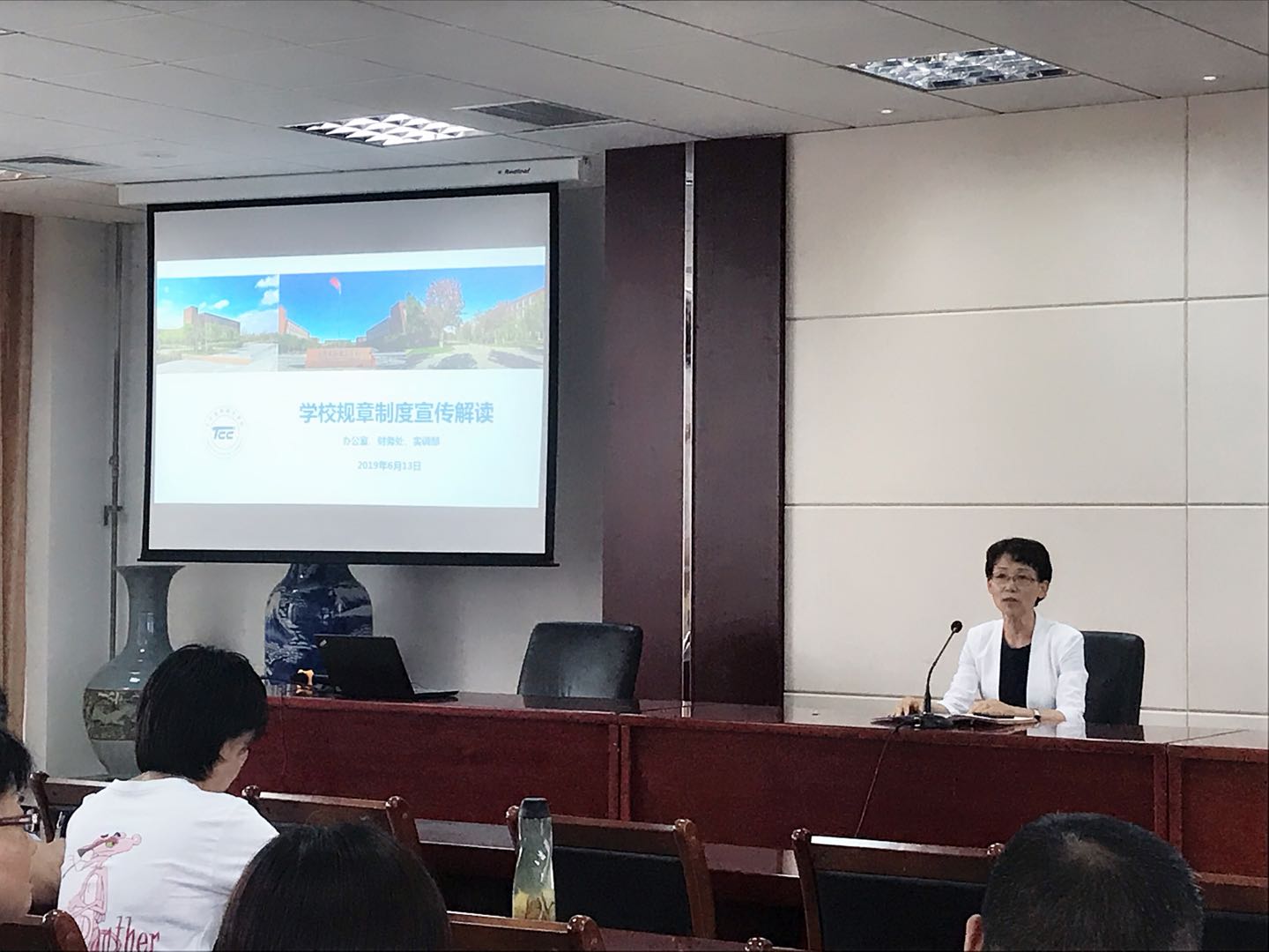 6月13日下午,学校举办规章制度宣传解读系列活动(第一场)。尹秀琴副校长出席并讲话,各部门负责人、文书人员、预算管理员、资产联系人、采购联系人60余人参加会议。