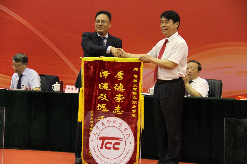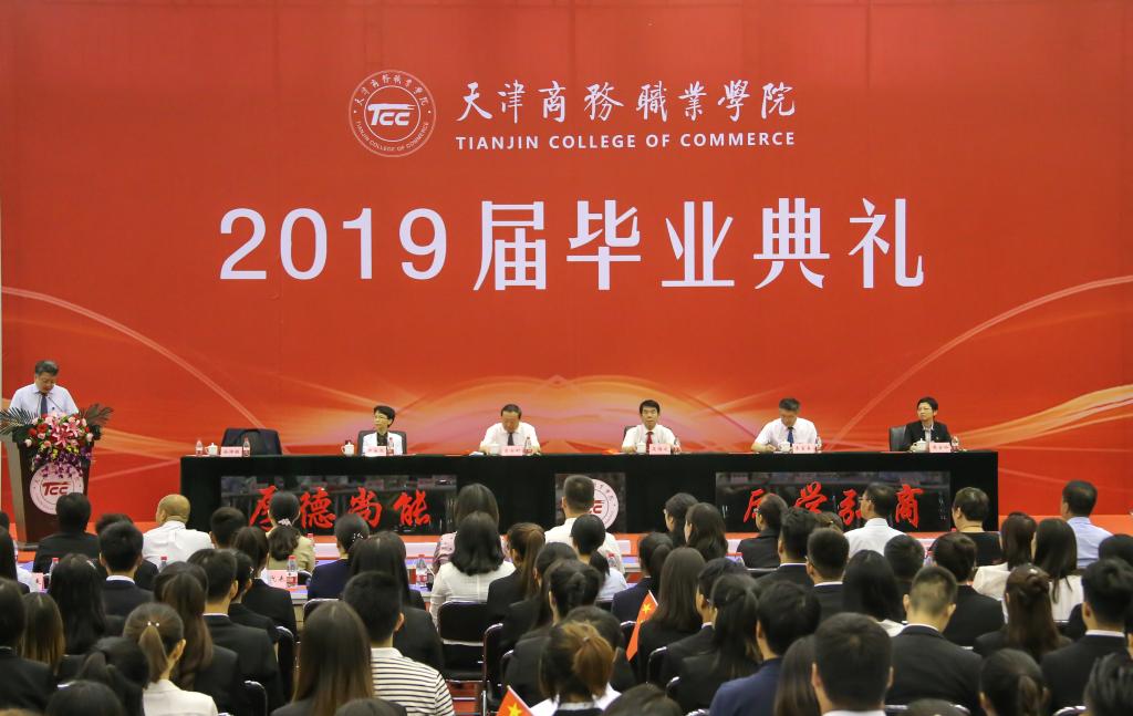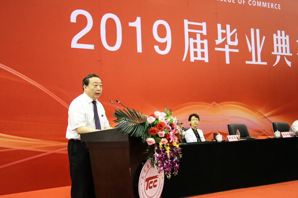 典礼上学校领导向2019届毕业生颁发毕业证书,并对优秀毕业生进行表彰。国际贸易学院优秀毕业生张喜月代表全体毕业生发言,以感恩为题抒发了毕业生对母校辛勤培养的感谢和即将离校的依依不舍。学校优秀教师代表,2018年度天津市师德先进个人荣宁宁老师勉励毕业生要敢于下定决心,挑战自我,实现理想。学校2019年度自强之星,应用外语学院李鹏飞同学家长发表感言,高度评价了学校的育人成果,并向学校赠送“厚德崇志,尚能育才,泽流及远,千里思源”锦旗以表达感激之情。“中华老字号”天津老美华鞋业服饰有限公司董事长韩志永作为企业嘉宾高度赞赏了学校校企共建的人才培养模式并与2019届毕业生分享了初入职场的宝贵经验。