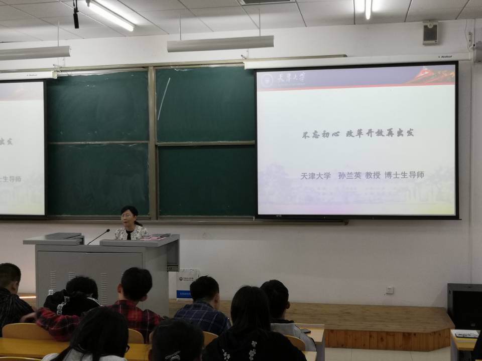 近日,天津市高校思想政治理论宣讲 “教授团”成员天津大学孙兰英教授在我校公共教学楼201教室为我校近300名学生做了一场精彩的思想政治理论宣讲,宣讲的主题是 “不忘初心,改革开放再出发”。