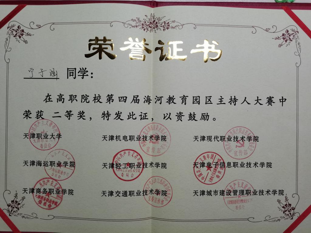 11月27日,第四届海河教育园区 “礼赞新中国、青春新时代”主持人大赛在机电学院报告厅举办,来自职业大学、现代、海运、轻工、电子信息等九所院校的选手同场竞技,我校营销学院物流1902班宁子涵同学荣获二等奖。