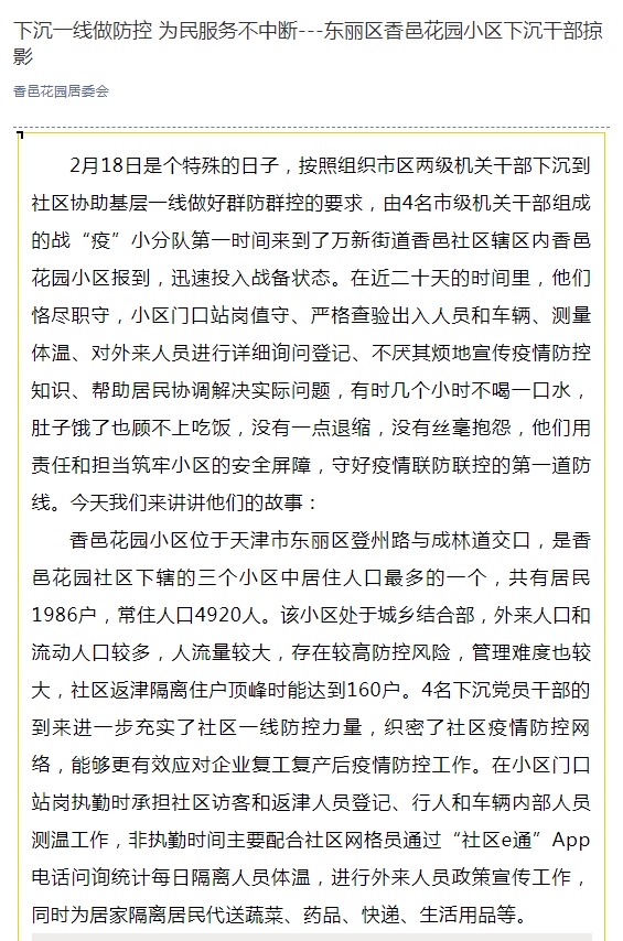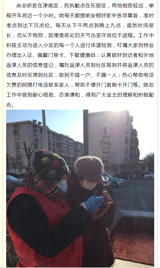 近日,东丽区香邑花园居委会公众号以《下沉一线做防控 为民服务不中断---东丽区香邑花园小区下沉干部掠影》为题报道我校科研处教师尚会妍。