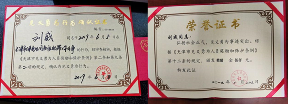 刘威同学勇斗歹徒的事迹经津南区公安局、津南区见义勇为协会根据有关规定,确认为见义勇为行为。2019年10月23日,天津市见义勇为协会为其颁发见义勇为荣誉称号证书及奖金。