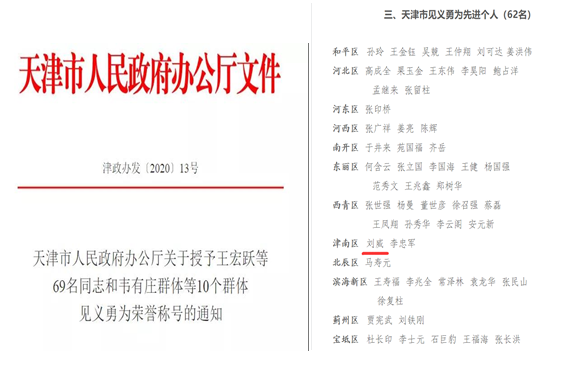 4月24日,天津市人民政府办公厅发布《天津市人民政府办公厅关于授予王宏跃等69名同志和韦有庄群体等10个群体见义勇为荣誉称号的通知》中,会计学院2017届毕业生刘威同学被授予“天津市见义勇为先进个人”荣誉称号,“天津法制传媒”录制了宣传片,高度赞扬了他们不顾个人安危,不惜牺牲个人利益,敢于同违法犯罪行为作斗争,保护国家利益、社会公共利益和人民群众生命财产安全,为全社会作出了表率、树立了榜样,为维护良好的社会治安环境作出了重要贡献。