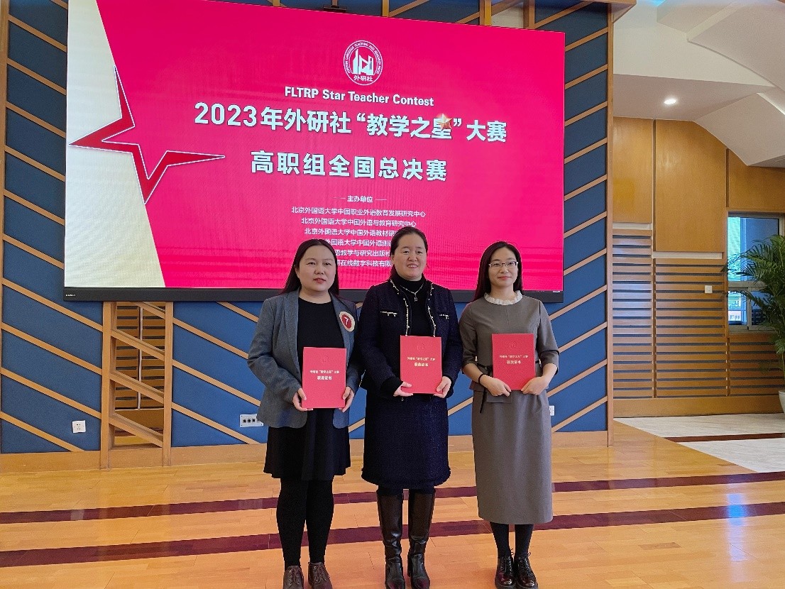 2023年,公共外语教学部荣宁宁、陈丽、樊文霞教师团队参加外研社“教学之星”大赛高职组比赛,在激烈角逐中冲入全国总决赛,获得一等奖。团队基于英语教学特点,结合学校商科专业特色,精心设计,精彩展示,以“数字赋能,英专相融”的教学理念呈现乐学实用的英语课堂,充分展现学校英语教学的“三教改革”成果:语言教学,拥抱技术,数字赋能,创新育人,全力助推职业教育高质量发展。